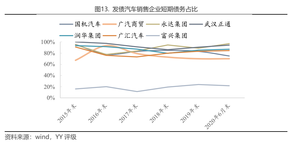 汽車銷售企業(yè)的債務(wù)結(jié)構(gòu)呈現(xiàn)出高度短期化特征,7家發(fā)債汽車銷售企業(yè)中除富興集團(tuán)外,其他企業(yè)的短期債務(wù)占比皆在70%以上,平均占比達(dá)到75.7%。短期化的融資安排部分是企業(yè)資質(zhì)較弱、長期融資能力差所致,但更主要的是這與其資產(chǎn)期限結(jié)構(gòu)是匹配的。汽車銷售企業(yè)最重要的資產(chǎn)構(gòu)成為營運(yùn)資本,包括貨幣資金以及汽車購銷中形成的預(yù)付款、存貨,流動(dòng)性較強(qiáng),上節(jié)計(jì)算出預(yù)收+存貨的合計(jì)周轉(zhuǎn)時(shí)間在2.5個(gè)月-3個(gè)月左右,因此理想的融資結(jié)構(gòu)是用短期債務(wù)為這些營運(yùn)資本融資。且汽車銷售利潤空間本來就窄,用短債替換長債節(jié)省財(cái)務(wù)成本也是必要的。
