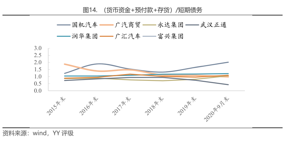 從債務(wù)壓力角度,我們可以通過(貨幣資金+預(yù)付款+存貨)對短債的覆蓋能力來看短期償債壓力是否可承受。預(yù)付款對象主要是上游大型車企,信用資質(zhì)較好,而存貨主要是汽車整車,汽車整車滿足標(biāo)準(zhǔn)化、價(jià)格公開透明、單品價(jià)值高、易于審計(jì)的特點(diǎn),因此資產(chǎn)質(zhì)量也較實(shí),且變現(xiàn)速度也很快。
