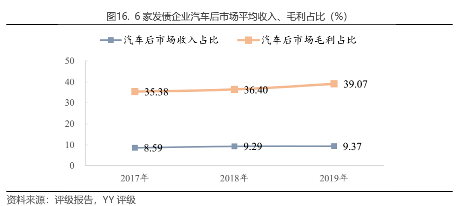 6家發(fā)債企業(yè)平均來看,汽車后市場以約10%的收入占比貢獻(xiàn)了約40%的毛利。且近些年來,無論是收入占比還是毛利占比,都呈現(xiàn)穩(wěn)步提升的態(tài)勢。