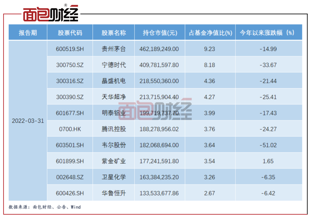 圖3:2022年一季度前十大持倉及今年以來漲跌幅