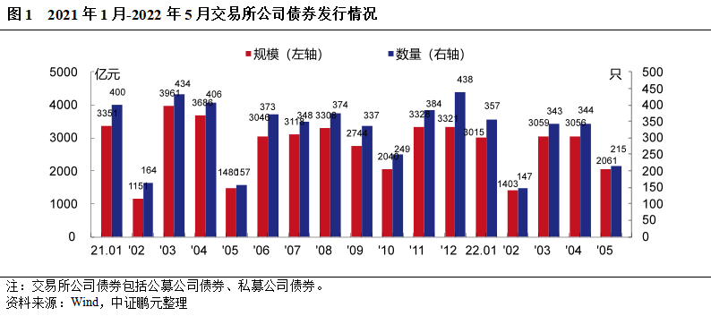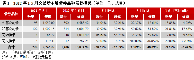 綜合1-5月來看,交易所債券市場共發(fā)行信用債券1,466只,發(fā)行規(guī)模13,874.92億元,比2021年同期相比發(fā)行數(shù)量和規(guī)模分別下降10%和6%。其中,公募公司債發(fā)行規(guī)模累計同比分別增長4%,私募公司債發(fā)行規(guī)模累計同比下降18%。