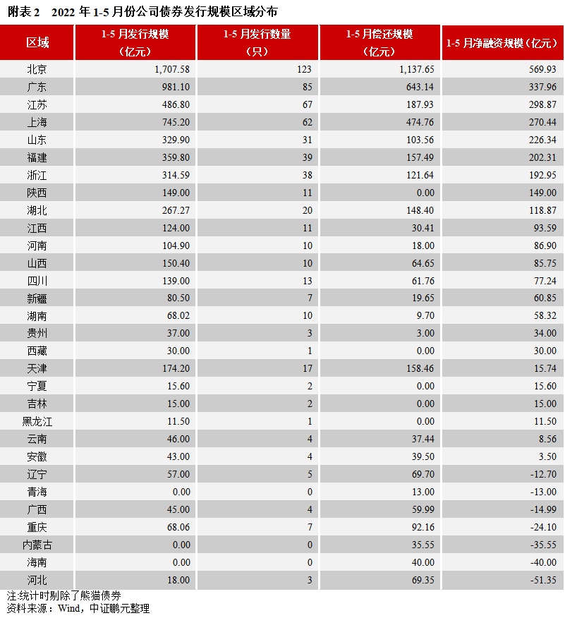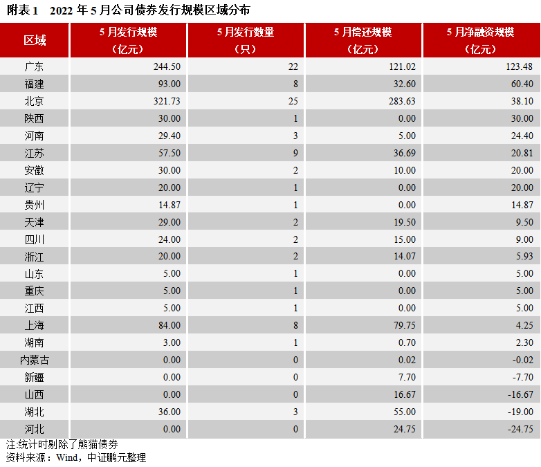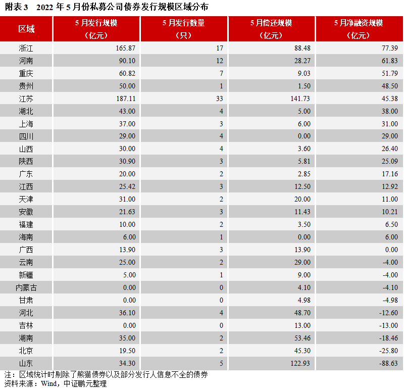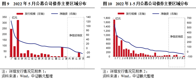區(qū)域分布方面,5月份公募公司債券主要集中于北京、廣東、福建等地,私募公司債券主要集中在江蘇、浙江、河南等地。