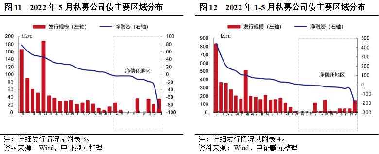 私募公司債券方面,2022年5月份,公募公司債券的發(fā)行人分布于23個地區(qū),以江蘇、浙江、河南等地為主。從發(fā)行規(guī)模來看,江蘇發(fā)行187.11億元位居榜首,浙江發(fā)行165.87億元位居第二,河南發(fā)行90.10億元位居第三位,發(fā)行數(shù)量分別為33只、17只、12只。浙江、河南、重慶分別以凈融資77.39億元、61.83億元、51.79億元位于前三位,山東、北京、湖南分別凈償還88.63億元、25.80億元、18.46億元。綜合1-5月,江蘇以發(fā)行209只、累計發(fā)行規(guī)模828.02億元位居首位,遠高于其地區(qū);浙江以發(fā)行104只、累計發(fā)行規(guī)模510.18億元位居第二;山東以發(fā)行68只、累計發(fā)行規(guī)模364.09億元位居第三;浙江、安徽、江蘇分別以累計凈融資449.80億元、315.27億元、211.15億元位于前三位,北京、云南、新疆分別凈償還199.30億元、43.61億元、42.80億元。
