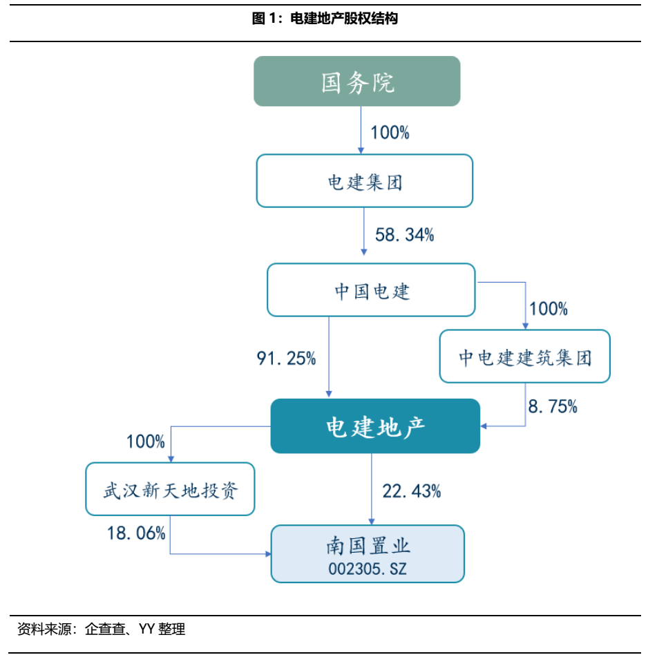 2005年11月,作為首批獲得國資委核定的16家主營房地產開發與經營業務的央企,中國電建地產集團有限公司(以下簡稱“電建地產”)重組成立。電建地產是中國電力建設股份有限公司(以下簡稱“中國電建”)房地產業務的核心子公司,國資委通過中國電力建設集團有限公司(以下簡稱“電建集團”)間接持有電建地產58.34%的股份,為公司實際控制人。電建地產旗下持有上市公司南國置業股份有限公司(以下簡稱“南國置業”)。