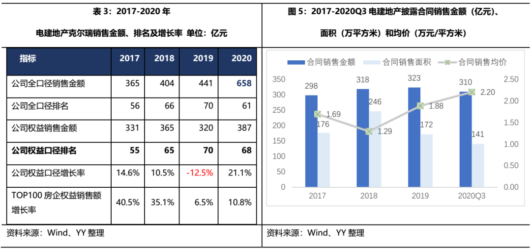 銷售方面,與行業水平相比,電建地產2017-2019年全口徑和權益口徑銷售金額排名均有所滑坡,銷售增速也低于TOP100房企的行業平均水平,但隨著公司2020年下半年開始發力,各項銷售指標有所提升,公司2020年權益口徑銷售金額增長217億元。