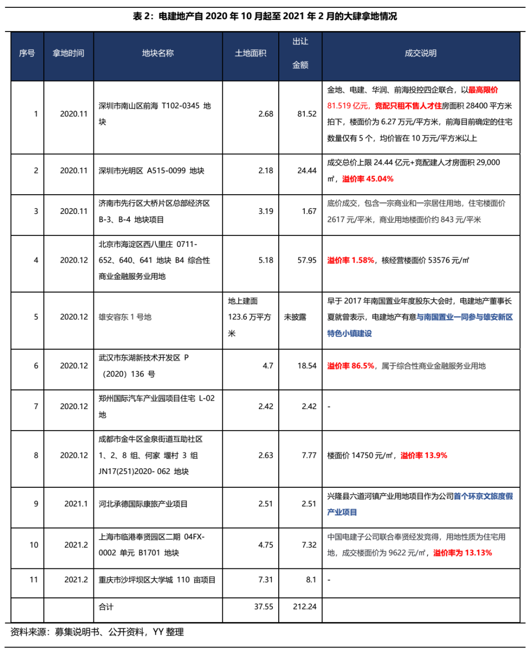 ① 2020年10月到2021年2月拿地金額超過200億元,公司2019年總拿地金額為271億元,且近期所拿部分地塊溢價率較高,且開始涉足雄安特色小鎮、環境文旅項目等新領域;