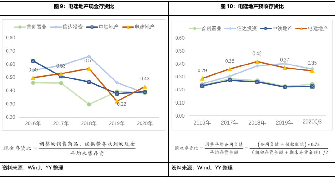 存貨去化方面,2019年以后公司回款和預售情況均滑坡較多,疊加2020年疫情湖北受重創,整體毛利率2020年也跌破正值,去化壓力較大。從現金存貨比觀測回款情況,公司2019年及2020Q3回款惡化,主要是公司加大了合作開發力度,且回款進度放緩。從預收存貨比觀測預售情況,公司近五年基本維持在30%以上,2019年以來下降明顯,但整體預售情況好于資質和規模相近的中鐵地產和首創置業。