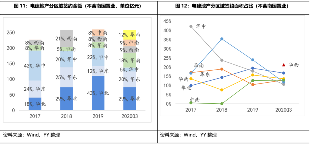 公司近四年簽約銷售金額增長較為平緩,銷售區域分布朝著“全國范圍內更加合理均衡的戰略布局”調整。截至2020Q3,簽約金額占比較高的區域為華北29%、華東20%和華南18%,簽約面積貢獻較多的是華西21%、華北17%和華南14%,整體區域集中度較低,能夠較好的分散區域政策風險。