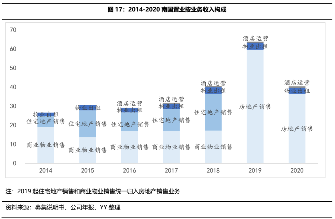 按業務來看收入構成,公司主要依靠住宅地產和商業物業銷售、物業出租和少量酒店運營實現收入,2019年公司的營收突增也主要來自于房地產銷售(即住宅地產和商業物業銷售)。