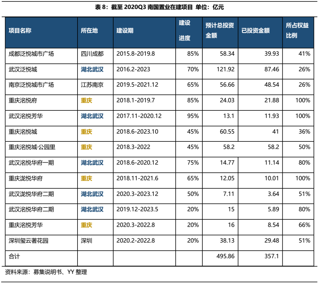 截至 2020 年 9 月底,南國置業現有在建項目共13個,主要集中在武漢(5個)、重慶(5個)等城市,區域集中度仍然很高;從權益占比來看,公司開始加大合作拿地力度,也在尋找新的突破路徑;依據所占權益比例,六個項目剩余擬投資金額敞口共計 62.54 億元。