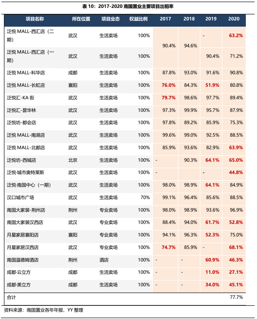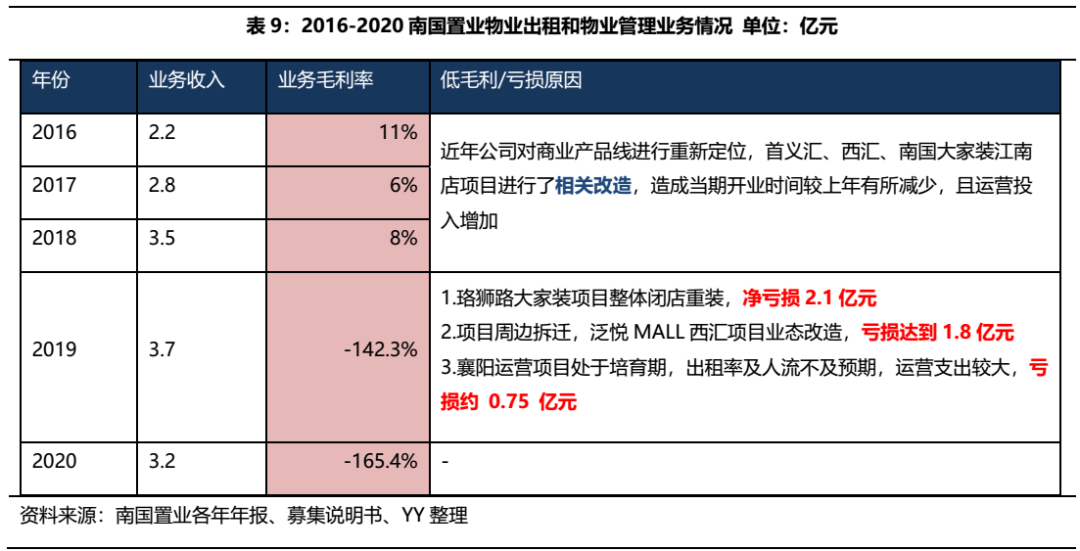 物業出售業務方面,2016-2019年公司對旗下商業產品線進行了大規模的改造,期間內物業出售及物業管理板塊的毛利率一直很低。2019年公司披露珞獅路大家裝項目、泛悅MALL西匯項目主要改造項目虧損合計3.9億元,而當年物業出租板塊業務收入僅為3.7億元,業態調整確實為虧損的直接原因,而2020年在疫情的沖擊更是雪上加霜。