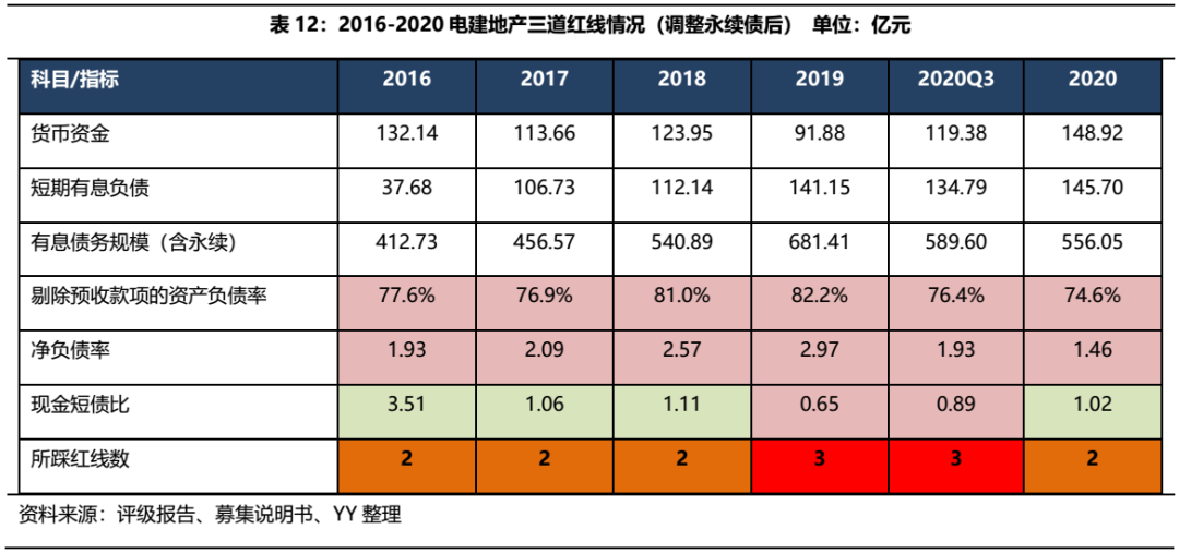 2015-2019年,電建地產有息債務規模持續膨脹,若將永續債納入有息負債范疇,2019年末有息債務達到681.41億元,現金短債比也轉紅,三條紅線均觸線,年末凈負債率為1.03,現金短債比為1.02,剔預負債率和凈負債率雖有所改善,但2020年底仍踩兩條紅線,現金短債比也在觸線邊緣徘徊,暫為橙檔企業。