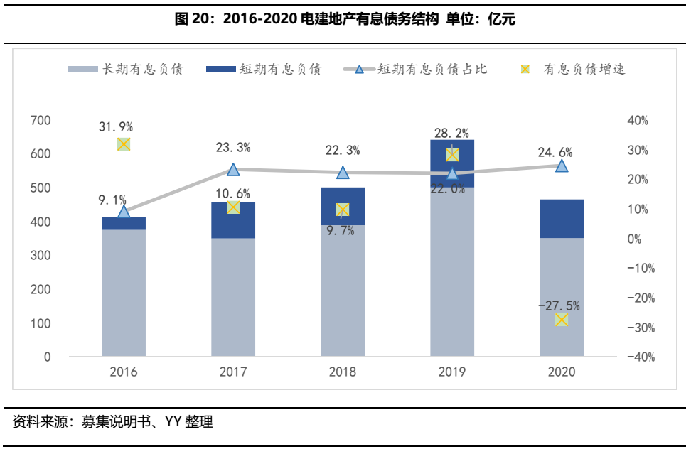 2016-2019年公司有息負債規模仍是正增長,反應了債務驅動的經營模式;2020有息負債首次負增長。結構方面,公司融資結構以長期債務為主,截至2020年末,公司短期有息負債規模為114.50億元,占有息負債比重的24.6%,償付節奏較為均衡。