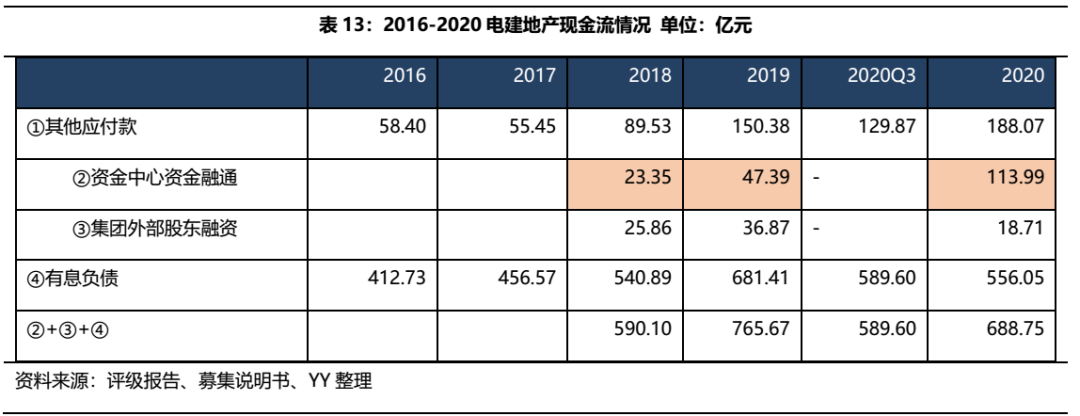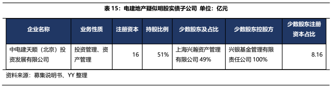 截至2020Q3,電建集團納入合并報表范圍的一級子公司共計 49 家,其中非全資子公司 25 家,截至2020年末,南國置業納入合并子公司29家,其中非全資子公司13家,通過查找少數股東,僅發現中電建天順(北京)投資發展有限公司疑似存在明股實債,少數股東控股方為興銀基金,少數股東注冊資本為8.16億元。