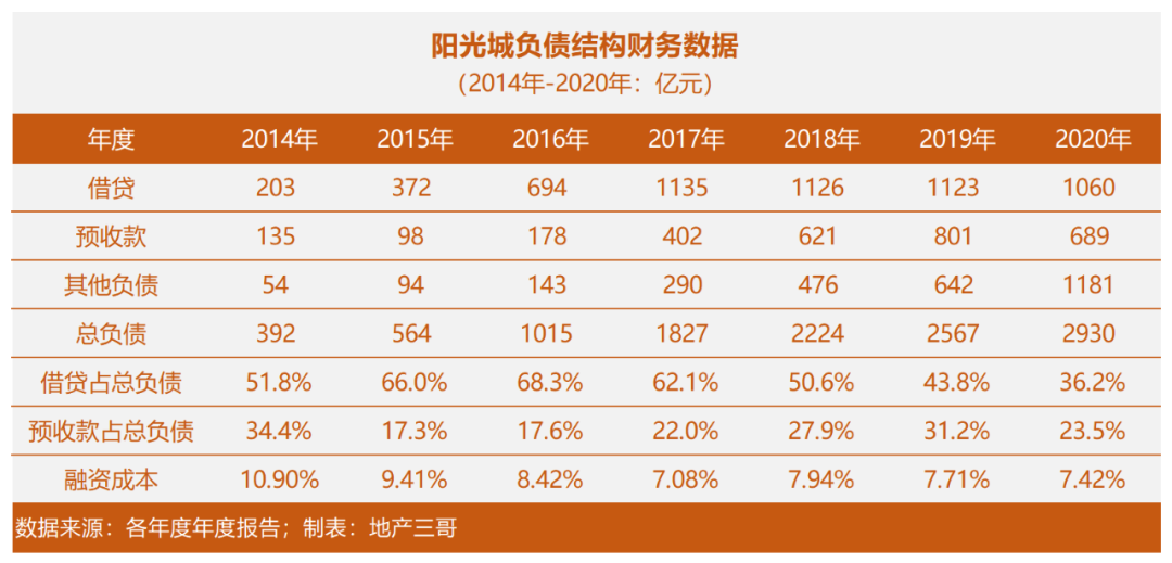 2017年到2020年,陽光城的借款持平略有減少,占總負(fù)債比例從68%降低到36%。