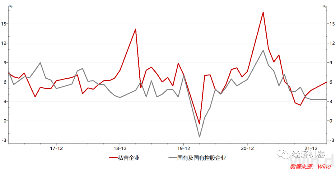 從所有制類型看,私營企業增加值持續提速。3月份增加值增速達到6%,連續3個月加速。與之對比,國有企業增速則在持續回落,3月維持在3.3%,與上月持平(圖4)。私營企業的恢復表明營商環境的持續改善,這與去年近來對“能耗雙控”政策的調整放松,以及今年支持中小微企業,持續推進減稅退稅工作是一致的。