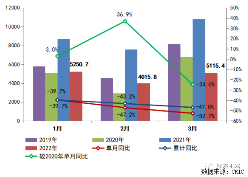 3月克而瑞數據也顯示,100強房地產開發企業單月實現銷售金額5115.4億元,單月同比降低52.7%,較2020年同期下跌24.6%,累計同比下跌52.7%。