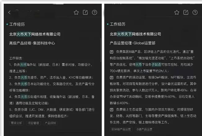 上述用戶的共同點(diǎn)在于,大量huobi global工作人員在北京火幣天下網(wǎng)絡(luò)科技有限公司入職,期間涉及多個(gè)部門,工作內(nèi)容也都涉及到實(shí)際業(yè)務(wù)運(yùn)營(yíng),還包括不同部門之間的對(duì)接協(xié)調(diào)。