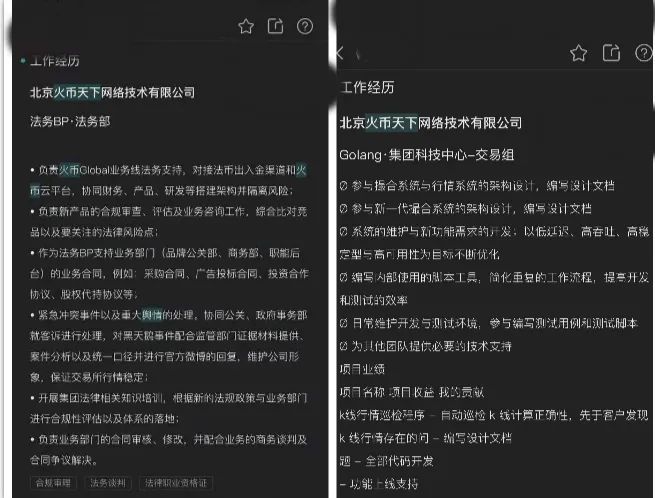 在目前Boss直聘求職者中多名北京火幣天下網(wǎng)絡(luò)科技有限公司員工明確標(biāo)注了自身在Huobi global運(yùn)營(yíng)部、集團(tuán)科技中心、法務(wù)部、開放平臺(tái)事業(yè)部、火信事業(yè)部、用戶研究中心等部門的工作經(jīng)歷,職務(wù)包括法務(wù)BP、產(chǎn)品經(jīng)理、運(yùn)營(yíng)經(jīng)理、工程師不等,工作時(shí)限大多為2018年至今,且近期在招聘平臺(tái)上較為活躍。