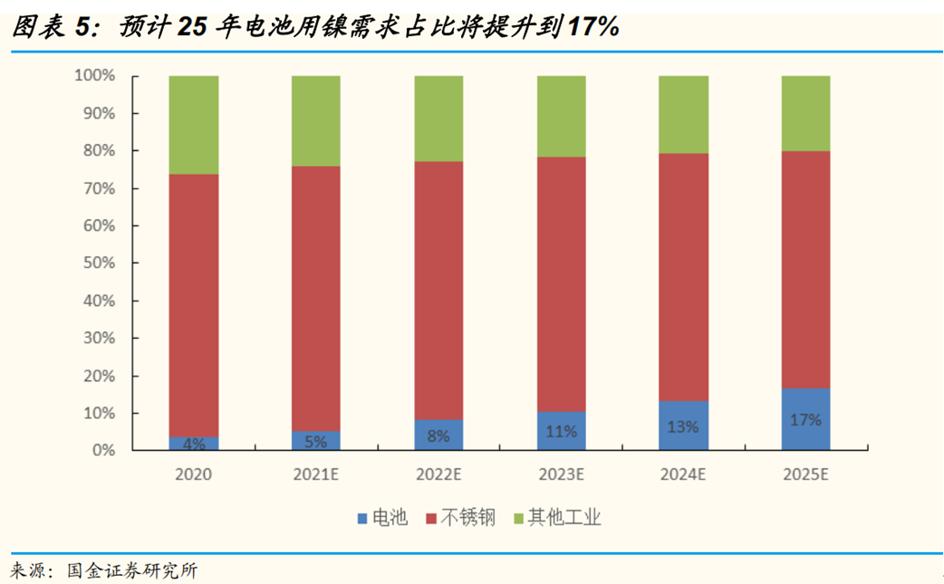 由于近兩年不銹鋼市場(chǎng)中下游的貿(mào)易企業(yè)和加工企業(yè)也較少進(jìn)行冬儲(chǔ),過低的社會(huì)庫存,也導(dǎo)致市場(chǎng)價(jià)格傳導(dǎo)十分迅速。雖然近期不銹鋼也出現(xiàn)一定幅度上漲,可是明顯滯后。按照當(dāng)前的鎳價(jià),不銹鋼生產(chǎn)企業(yè)生產(chǎn)成本已出現(xiàn)倒掛。可以看出,較低庫存疊加下游不銹鋼需求回暖是構(gòu)成鎳漲價(jià)的原因之一。但顯然不是本輪鎳逼空行情的緣由。動(dòng)力電池未來呈現(xiàn)出提升能量密度的高鎳化趨勢(shì),鎳在電池端的用量逐步提升。預(yù)計(jì)25年電池領(lǐng)域用鎳需求將達(dá)到58萬噸,5年CAGR=48.62%,需求占比將從20年的3%提升到25年的17%。2021年,在新能源車需求高景氣度的前提下,鎳價(jià)總體呈上行的態(tài)勢(shì)。同時(shí)受疫情、運(yùn)輸、人力等問題影響,供應(yīng)增長速度不及需求增長速度,鎳供需平衡總體短缺。