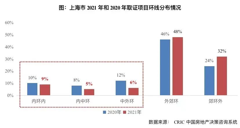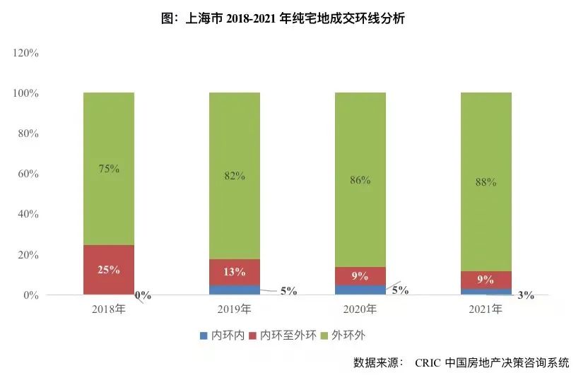 究其根本,新增供應(yīng)短缺的背后實(shí)則是外環(huán)內(nèi)宅地供應(yīng)稀缺,從2018-2021年純宅地成交環(huán)線來(lái)看,仍以外環(huán)外為主,占比逐年遞增,已近9成,外環(huán)內(nèi)累計(jì)占比則逐年回落,2021年僅為12%,而內(nèi)環(huán)內(nèi)市中心純宅地更是稀缺,2021年占比僅為3%。由此不難推斷,2022年上海市區(qū)單價(jià)10萬(wàn)元/平以上新盤(pán)仍將延續(xù)此前的供不應(yīng)求,“一房難求”的高熱成交情況短期還是難以緩解。