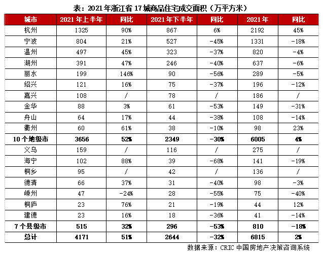 2021年上、下半年,浙江省房地產(chǎn)市場(chǎng)強(qiáng)、弱轉(zhuǎn)折,上半年市場(chǎng)異常火爆,下半年則持續(xù)轉(zhuǎn)冷。據(jù)CRIC監(jiān)測(cè)數(shù)據(jù)顯示,上半年浙江省10個(gè)地級(jí)市商品住宅成交3656萬(wàn)平方米,同比增長(zhǎng)52%,7個(gè)縣級(jí)市成交515萬(wàn)平方米,同比增長(zhǎng)32%。其中,杭州、海寧等成交顯著放量,同比漲幅都在90%附近,麗水更是翻倍增長(zhǎng)。下半年10個(gè)地級(jí)市成交跌至2349萬(wàn)平方米,同比下降30%;7個(gè)縣級(jí)市成交降至296萬(wàn)平方米,同比下降53%。其中,金華、海寧等市場(chǎng)持續(xù)低迷,成交同比腰斬。