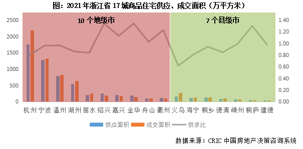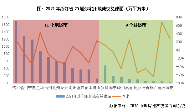 展望2022年,浙江省房地產(chǎn)市場(chǎng)前景很大程度上將取決于供求關(guān)系,聯(lián)系到近兩年浙江省涉宅用地成交規(guī)模持續(xù)下行,預(yù)計(jì)房地產(chǎn)市場(chǎng)仍將實(shí)現(xiàn)供求平衡。2021年,浙江省11個(gè)地級(jí)市涉宅用地成交總建面8230萬(wàn)平方米,同比下降10%,9個(gè)縣級(jí)市涉宅用地成交總建面1262萬(wàn)平方米,同比下降21%。