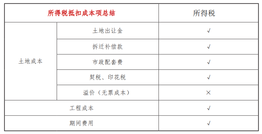 從組成上來看:準予扣除金額 = 已銷開發產品計稅成本 + 期間費用 + 稅金附加