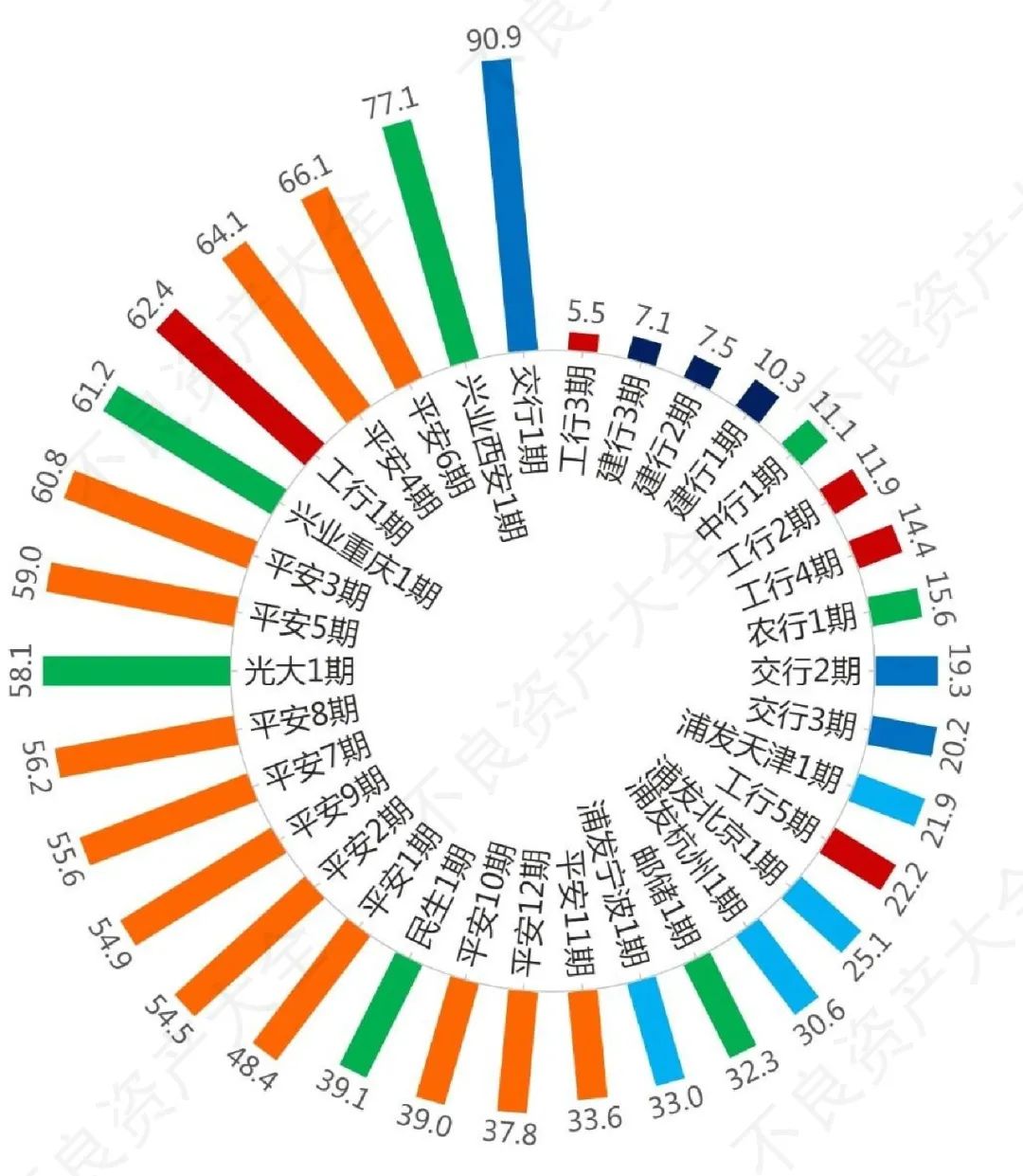 從已公告的34期銀行個貸不良資產來看,建行的三期平均逾期月數(按未償本息加權平均,下同)只有七個半月,即便在傳統清收領域,也不算長賬齡資產。而平均逾期月數最長的為平安銀行,接近五年。此外,工商銀行為41.6個月,交通銀行為31.9個月,浦發銀行為27.1個月,其余銀行則為1至5年不等。其中單期平均逾期月數最長的為交行1期的90.9個月,賬齡超過七年半;最短的為工行3期不足半年。就銀行個貸不良來看,賬齡分布比較全面,客觀上基本照顧到了不同賬齡專長的資產管理公司或處置機構。