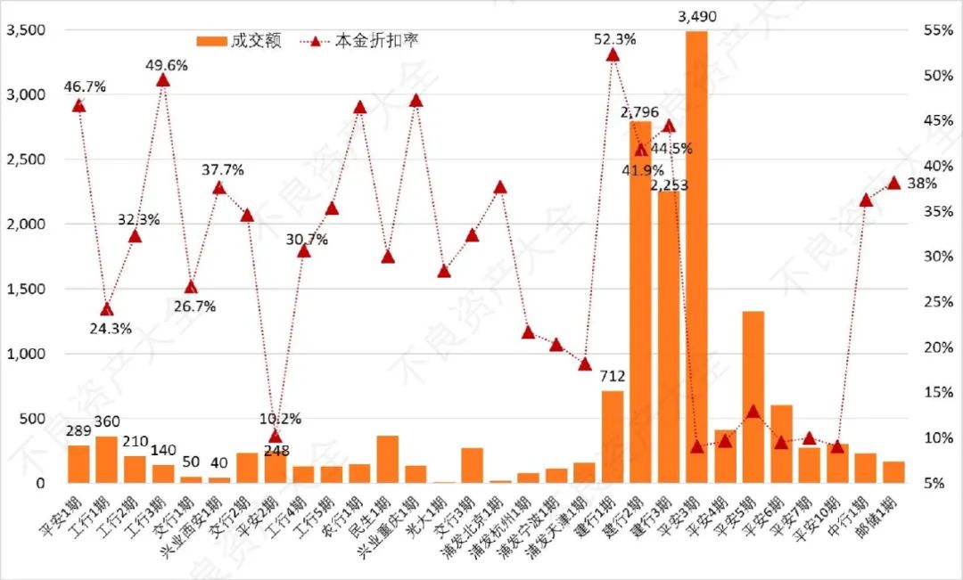 成交額固然是資產管理公司競價的時候考慮的重要因素之一,但成交額主要受預算限制,真正體現不良資產價格實質上是本金折扣率。從已經公布成交情況的若干期不良資產來看,平安銀行的本金折扣率整體偏低,建設銀行的正好相反,這也與各銀行出讓的不良資產總體情況相吻合。各期中本金折扣率最高的為建行1期,其也是各期中質量最高的不良資產之一。