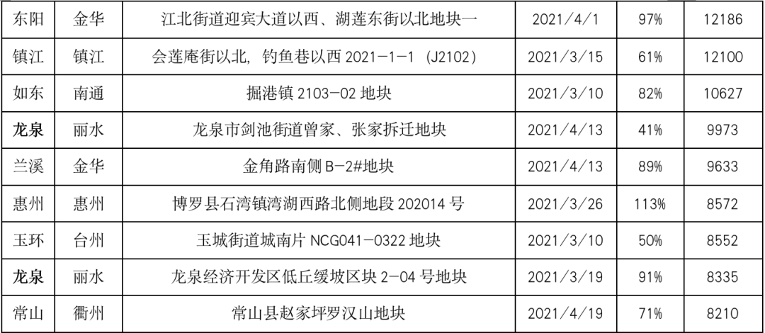 在此之前不久,2021年4月7日,浙江省衢州江山市黃陳小區北側地塊出讓,起拍價26266萬元,起始樓面價7924元/平方米,經296輪競價,該地塊最終由浙江萬榮湖北房地產有限公司以46366萬元競得,樓面價13987.15元/平方米,溢價率76.52%,樓面地價再創新高,這距離上宗“單價地王”誕生僅過去兩個月。