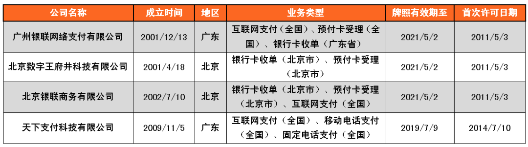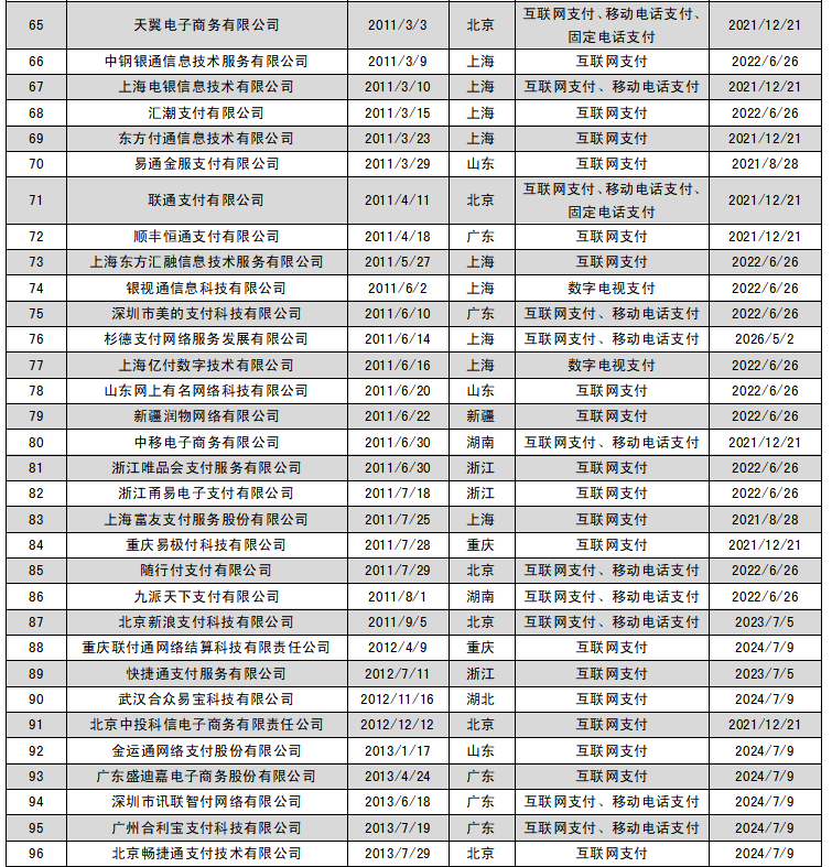 2021年5月13日,央行官網(wǎng)公布首批27張支付牌照續(xù)展結(jié)果,支付寶、財付通、銀聯(lián)商務(wù)、資和信、銀盛支付、通聯(lián)支付等24家支付機(jī)構(gòu)全部通過續(xù)展。廣州銀聯(lián)網(wǎng)絡(luò)支付有限公司、北京數(shù)字王府井科技有限公司、北京銀聯(lián)商務(wù)有限公司擬與其控股股東銀聯(lián)商務(wù)股份有限公司開展整合工作,向人民銀行提交了中止續(xù)展審查申請,在中止審查期間繼續(xù)開展業(yè)務(wù)。
