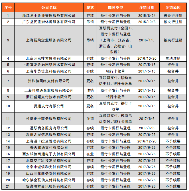 據(jù)央行官網(wǎng)公布數(shù)據(jù)顯示,目前已注銷牌照的機(jī)構(gòu)有39家,注銷原因中,被央行吊銷牌照的機(jī)構(gòu)有4家;因被合并而注銷牌照的有11家;被央行決定不予續(xù)展的有16家;主動申請注銷的有7家;未提交續(xù)展申請的1家。