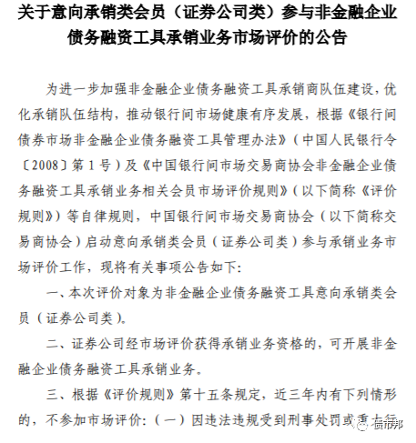 剛剛,協會網站又公布了《關于意向承銷類會員(證券公司類)參與非金融企業債務融資工具承銷業務市場評價的公告》,根據公告內容,協會未來將根據證券公司債券業務開展情況,進一步對證券公司主承進行擴容。