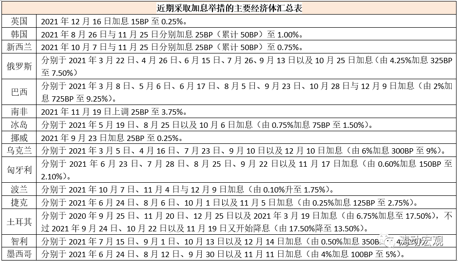 這意味著,當美聯儲Taper進程加快時,也意味著美聯儲加息步伐會提前(參見變局來襲——美聯儲年終議息會議評述),進一步意味著中國政策松一松的窗口期實際上是變得更短了,也更緊迫了。畢竟在美聯儲Taper加快的這段時期,中國經濟又出現了新的下行壓力,穩增長壓力正變得越來越突出,中國需要在美聯儲正式加息之前呵護好國內經濟基本面。特別是我們看到,2021年11月以來,已有英國、韓國、新西蘭、巴西、南非、烏克蘭、匈牙利、波蘭、捷克、智利和墨西哥等經濟選擇加息,既包括發展中國家,也包括韓國和新西蘭等發達經濟體。