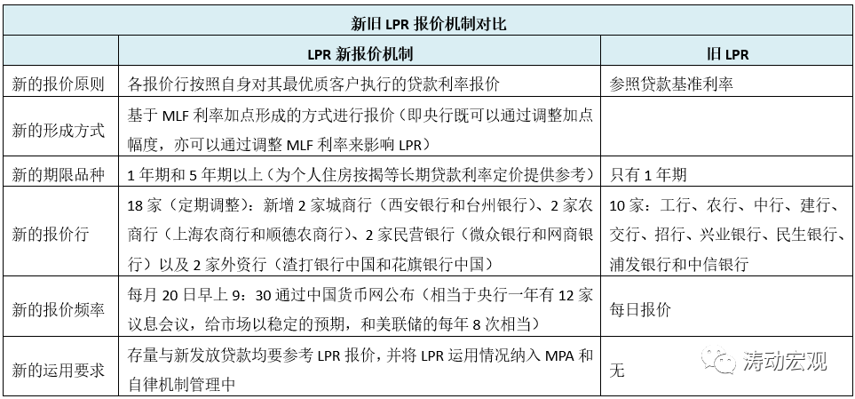 和2013年推出的LPR相比,LPR新報價機制有諸多創新之處,主要體現在報價原則(基于最優客戶)、形成方式(MLF加點)、期限品種(1年和5年以上)、報價行(數量更多且類型更豐富)、報價頻率(固定于每月20日)以及新的運用要求(通過MPA和自律機制管理)來強化約束等方面。