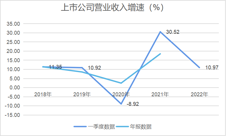 2022年一季度A股公司實(shí)現(xiàn)收入16.49萬(wàn)億元,同比增速為10.97%,與疫情前的2018-2019年一季度相當(dāng)。收入的增長(zhǎng)代表著經(jīng)濟(jì)總產(chǎn)值的增長(zhǎng),這一數(shù)據(jù)與一季度國(guó)內(nèi)GDP增長(zhǎng)趨勢(shì)相符。