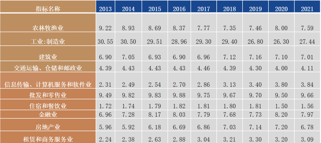從國(guó)家GDP的構(gòu)成來(lái)看,工業(yè)制造業(yè)一直是國(guó)家經(jīng)濟(jì)的第一大支柱產(chǎn)業(yè),盡管近些年來(lái)工業(yè)制造業(yè)增加值在GDP的占比中持續(xù)下降,但其2021年仍舊貢獻(xiàn)27.44%行業(yè)增加值,仍然是第一大行業(yè)。