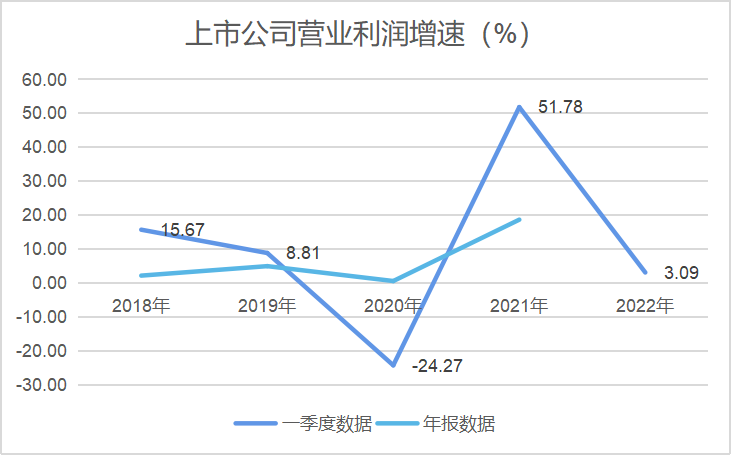 但是,2022年一季度A股公司營(yíng)業(yè)利潤(rùn)的增速僅3.09%,不僅遠(yuǎn)低于收入的增速,也遠(yuǎn)低于疫情前2018-2019年一季度的增速。