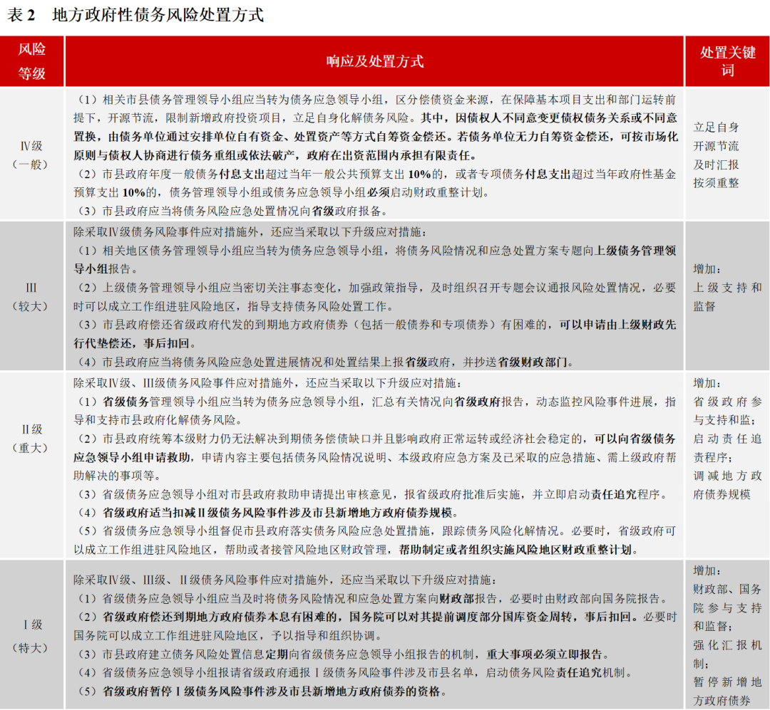 政府性債務風險處置:(1)分類處置。政府性債務,根據償還義務分為地方政府債券、非地方政府債券形式的存量政府債務,以及存量或有債務、新發生的違法違規擔保債務等,即顯性債務和隱性債務。其中,隱性債務,政府不承擔償還責任,僅承擔民事賠償責任。(2)分級處置。根據88號文,按照政府性債務風險事件的性質、影響范圍和危害程度等情況,劃分為Ⅰ級(特大)、Ⅱ級(重大)、Ⅲ級(較大)、Ⅳ級(一般)四個等級。針對不同等級的風險事件,將采取不同力度的處置措施,隨風險級別的上升,逐級增強管理和救助。(3)財政重整計劃。實施財政重整計劃的原因包括地方政府債務風險無法通過自身解除,或觸發強制重整條件。相比一般應急措施,財政重整計劃的處置思路與之一致,但對政府現金流的約束性和支持性更強,包括調整財政收支、投融資行為的審查、改進財政管理等方面。(4)政策側重點的轉換。隨著三年(2015-2017年)地方政府債券置換期的結束,非政府債券形式的存量政府債務基本轉換為地方政府債券。2020年來,政策聚焦“化解隱性債務”,加強地方政府債務風險管理,其化解核心依然是“償還”為主,償還方式包括地方政府債券置換、自有資金償還,債務重組等。