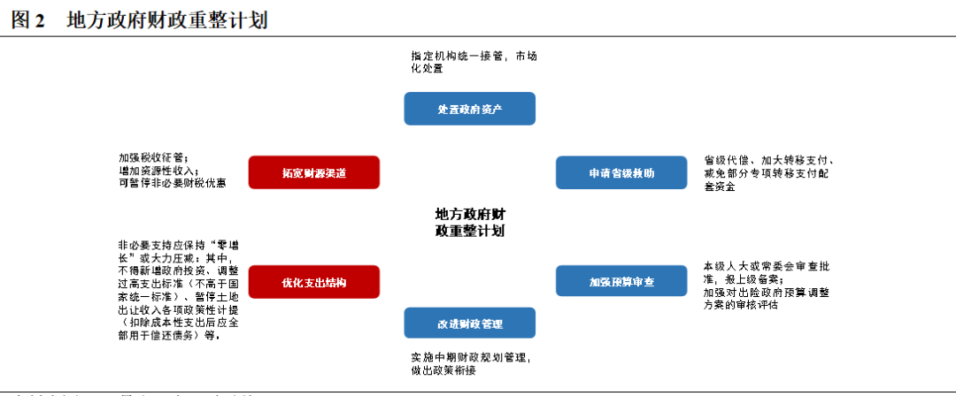 相比一般應急措施,財政重整計劃的處置思路與之一致,但對政府現金流的約束性和支持性更強,包括調整財政收支、投融資行為的審查、改進財政管理等方面。財政重整計劃期間,需保障必要的基本民生支出和政府有效運轉支出,不得因為償還債務本息影響政府基本公共服務的提供。從重整計劃設計看,最主要的方式是“開源節流”,尤其對支出領域進行嚴格限制,包括不得新批政府投資計劃,不得新上政府投資項目,不得設立各類需要政府出資的投資基金等,壓縮政府公用經費和控制人員福利開支,調整過高支出標準,暫停土地出讓收入各項政策性計提等。當地方政府性債務風險得到緩解、控制,地方政府實現財政重整目標,經上級政府債務管理領導小組或債務應急領導小組同意,終止應急措施。