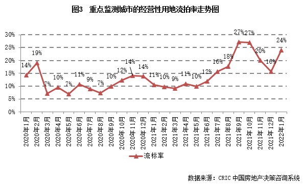 土地流拍方面。由于優(yōu)質(zhì)地塊占比較少,資金流仍面臨較大壓力的房企本月拿地意愿不強。因此,開年首月流拍現(xiàn)象較去年年末有所加重。以重點監(jiān)測的城市來看,1月土地流拍率并未延續(xù)去年年末的下降趨勢,反而回升至24%的較高水平。從流拍地塊所在城市來看,大部分流拍地塊集中在樓市處于調(diào)整周期的城市,如大連、哈爾濱、清遠、揭陽等,并且這些地塊多為含宅地塊。以大連為例,1月份主城區(qū)計劃出讓的5幅宅地全部因無人競價而流拍,土地市場明顯遇冷。