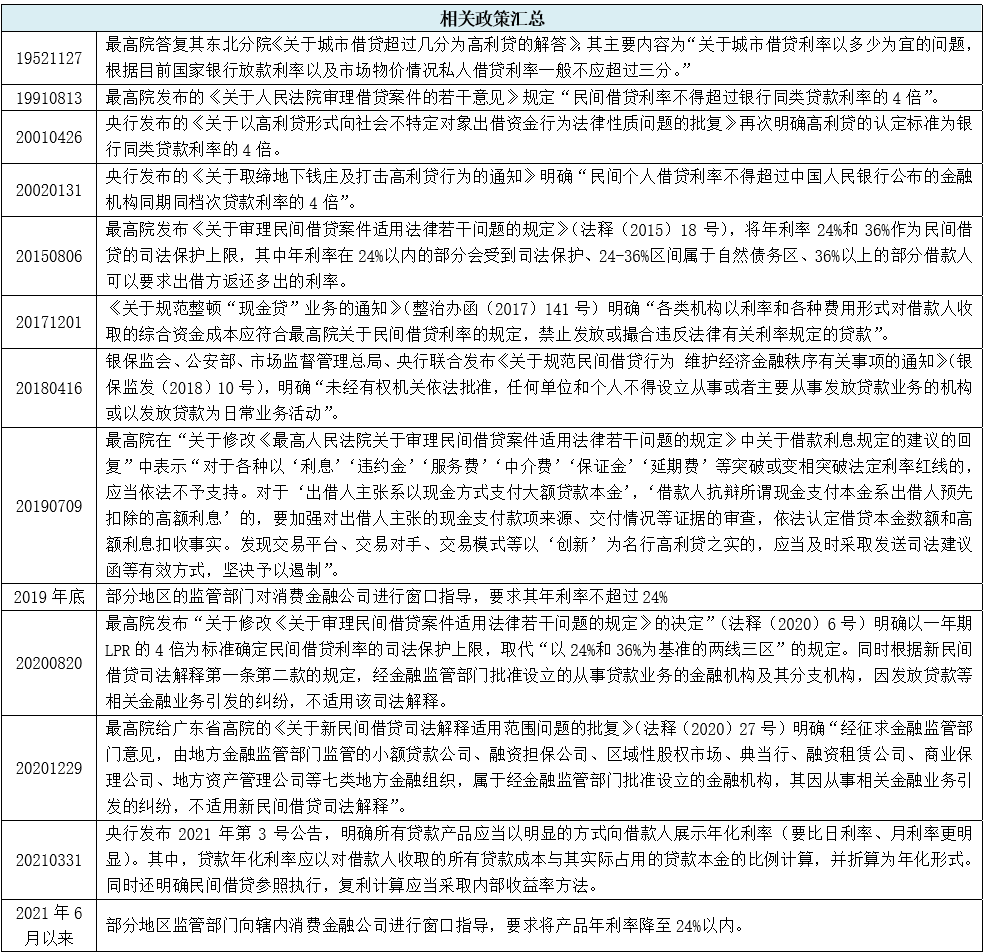2021年6月以來(lái),部分地區(qū)窗口指導(dǎo)轄內(nèi)消費(fèi)金融公司設(shè)定24%紅線(xiàn),要求其個(gè)人貸款利率全面控制在24%(主要指單利的IRR、而非APR)以?xún)?nèi),并設(shè)置一定過(guò)渡期。考慮到過(guò)去對(duì)貸款利率上限的控制主要集中于民間借貸、現(xiàn)金貸等領(lǐng)域,對(duì)持牌金融機(jī)構(gòu)貸款利率上限控制基本是首次,這可能意味著消費(fèi)金融行業(yè)已迎來(lái)變局。