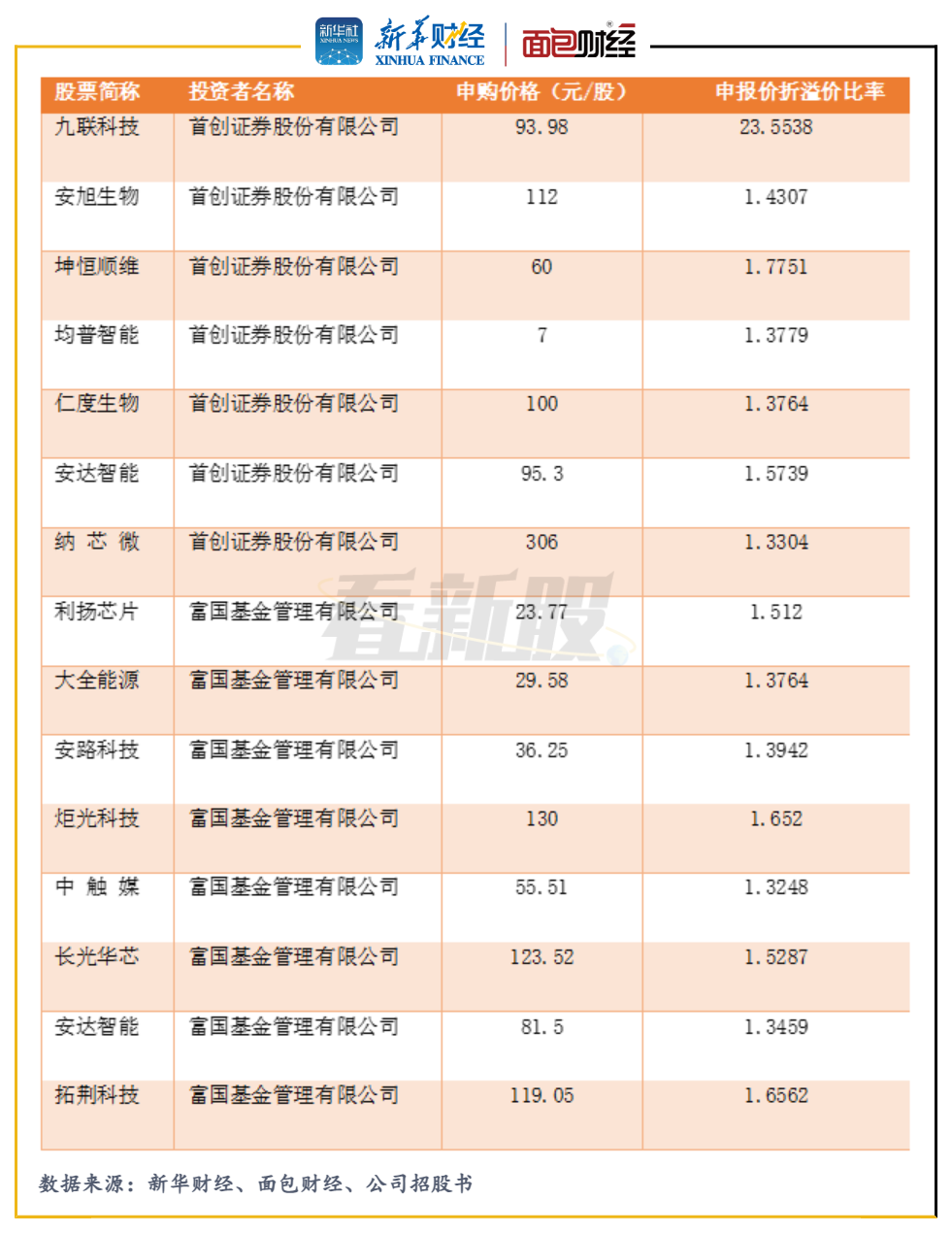 其中,首創證券和富國基金分別對7個和8個科創板新股報出明顯高價,高出其最終發行價超三成。