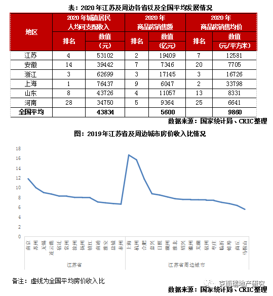 全國(guó)第二大商品房市場(chǎng),2019年數(shù)據(jù)顯示近8成城市房?jī)r(jià)收入比低于全國(guó)平均。2020年,江蘇省商品房銷(xiāo)售總額高達(dá)1.94萬(wàn)億元,占全國(guó)商品房銷(xiāo)售額的11.2%,僅次于廣東省,居于全國(guó)第2位。全省城鎮(zhèn)居民人均可支配收入為53102元,遠(yuǎn)高于全國(guó)平均的43834元,在全國(guó)31個(gè)省和自治區(qū)中排名第4,而2020年江蘇省商品房銷(xiāo)售均價(jià)僅為12581元/平方米,排名全國(guó)第7。從居民購(gòu)買(mǎi)力來(lái)看,江蘇房地產(chǎn)市場(chǎng)支撐強(qiáng)勁。具體城市而言,以2019年數(shù)據(jù)為例,江蘇省內(nèi)除了蘇州、南京以及無(wú)錫外,其他10個(gè)城市的房?jī)r(jià)收入比均低于全國(guó)平均水平。