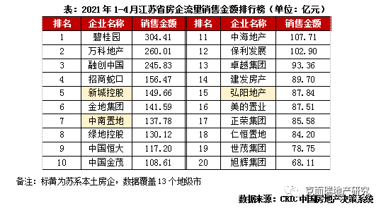 隨著外來(lái)房企的入駐和持續(xù)擴(kuò)張,本土房企的生存空間受到了擠壓。從2021年1-4月江蘇省房企流量銷(xiāo)售金額排行榜來(lái)看,基本是全國(guó)性品牌房企的天下,碧桂園、萬(wàn)科地產(chǎn)、融創(chuàng)中國(guó)包攬榜單前三位,也是1-4月份僅有的3個(gè)銷(xiāo)售業(yè)績(jī)超兩百億的房企。反觀蘇系本土房企,進(jìn)入榜單20強(qiáng)的只有中南、新城和弘陽(yáng)三家,且他們都在上海設(shè)有總部,正著力進(jìn)行大跨度的全國(guó)擴(kuò)張。此外,新城和中南雖保住了前十的地位,但相比碧桂園只有不到一半的銷(xiāo)售業(yè)績(jī)。