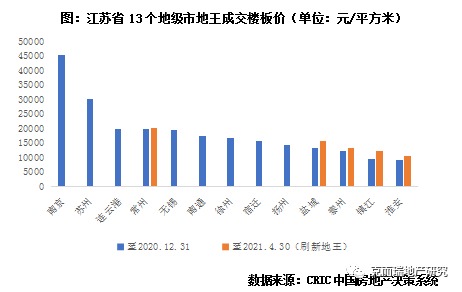 土拍市場(chǎng)競(jìng)爭(zhēng)激烈,地王頻出,地價(jià)交替激增。由于品牌開(kāi)發(fā)商較早進(jìn)駐,近年來(lái)又通過(guò)限地價(jià)穩(wěn)行情,據(jù)CRIC統(tǒng)計(jì),早在2016、2018年,南京和蘇州的地王樓板價(jià)就分別突破4.5萬(wàn)/平方米和3萬(wàn)/平方米,高于省內(nèi)其他城市,近兩年熱度不減,仍有德信、大家等中小房企涌入。同時(shí),至2020年4月30日,連云港、常州、無(wú)錫三個(gè)城市的地王樓板價(jià)也即將突破2萬(wàn)元大關(guān),特別是無(wú)錫,在不久前結(jié)束的首次集中供地中,成交16宗地塊有12宗都被50強(qiáng)房企拿下,平均可比地價(jià)上漲30%以上。一方面由于棚改需求釋放,另一方面由于外來(lái)開(kāi)發(fā)商加速進(jìn)駐,其他城市的地價(jià)也出現(xiàn)了不同程度的上升,部分在2021年前四月刷新了原先的地王樓板價(jià)。以宿遷為例,2020年下半年開(kāi)始地市明顯轉(zhuǎn)熱,幾乎每場(chǎng)土拍都有新的單價(jià)地王誕生。究其原因,主要是融創(chuàng)、綠城、正榮等品牌房企均在2020年進(jìn)入宿遷市場(chǎng),土拍競(jìng)爭(zhēng)越發(fā)激烈。如2020年12月末出讓的宿城16地塊經(jīng)歷了200余輪競(jìng)拍才由建發(fā)競(jìng)得,平均樓板價(jià)高達(dá)15600元/平方米,創(chuàng)下宿遷成交地價(jià)新高,而此前的單價(jià)地王宿城09地塊在當(dāng)年10月份拍賣(mài)時(shí)僅經(jīng)過(guò)了65輪競(jìng)拍。