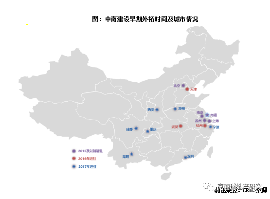 由于蘇系房企大本營(yíng)多在人口和經(jīng)濟(jì)條件皆比較好的蘇南區(qū)域,因此借由區(qū)域紅利,多數(shù)房企在創(chuàng)始初期深耕本省或長(zhǎng)三角區(qū)域,之后以長(zhǎng)三角為中心逐步向外擴(kuò)張,并且早期外拓以市場(chǎng)容量更大,風(fēng)險(xiǎn)系數(shù)更小的高能級(jí)城市為主。以目前蘇系規(guī)模最為突出的新城控股和中南建設(shè)為例: