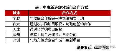 中南也普遍采用合作的方式進(jìn)駐新城,相較新城而言,中南的合作方式更加多樣。中南合作拓土模式代表城市有寧波、西安、深圳、天津、鄭州等,從其合作模式上來(lái)看,中南合作的方式非常多樣:像企業(yè)新進(jìn)寧波時(shí)是通過(guò)與德信合作斬獲一塊司法拍賣(mài)土地;新進(jìn)西安、天津是通過(guò)收并購(gòu)項(xiàng)目股權(quán),之后在西安還通過(guò)與當(dāng)?shù)卣灱s合作進(jìn)一步擴(kuò)大業(yè)務(wù),涉及特色小鎮(zhèn)、城市更新以及PPP項(xiàng)目合作等多種類(lèi)型,通過(guò)大規(guī)模合作,進(jìn)駐西安第二年中南銷(xiāo)售額即突破百億;而新進(jìn)鄭州則是通過(guò)與本土房企合作設(shè)立合資公司;新進(jìn)深圳則是通過(guò)與地方性房企合作城市更新項(xiàng)目。