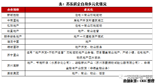 蘇系房企整體較為專(zhuān)注地產(chǎn)主業(yè),涉足的多元化范圍相對(duì)較窄,基本上主要圍繞地產(chǎn)相關(guān)業(yè)務(wù)。如蘇州高新涉及地產(chǎn)、節(jié)能環(huán)保、戰(zhàn)略新興產(chǎn)業(yè)、非銀金融與產(chǎn)業(yè)投資。此外,蘇系房企還有一個(gè)典型特點(diǎn)為基本上都是“雙輪驅(qū)動(dòng)”協(xié)同發(fā)展。新城控股、弘陽(yáng)地產(chǎn)、紅星地產(chǎn)和蘇寧置業(yè)等都是地產(chǎn)+商業(yè)運(yùn)營(yíng),地產(chǎn)為商業(yè)引流賦能,反之商業(yè)也能為地產(chǎn)溢價(jià)賦能,由此商業(yè)與地產(chǎn)將發(fā)揮協(xié)同效應(yīng),打造差異化優(yōu)勢(shì)。此外還有起家建筑行業(yè)的中南置地專(zhuān)注房地產(chǎn)開(kāi)發(fā)+建筑施工,朗詩(shī)地產(chǎn)地產(chǎn)+輕資產(chǎn)代建模式,銀城國(guó)際則是地產(chǎn)+物業(yè)服務(wù)組合。